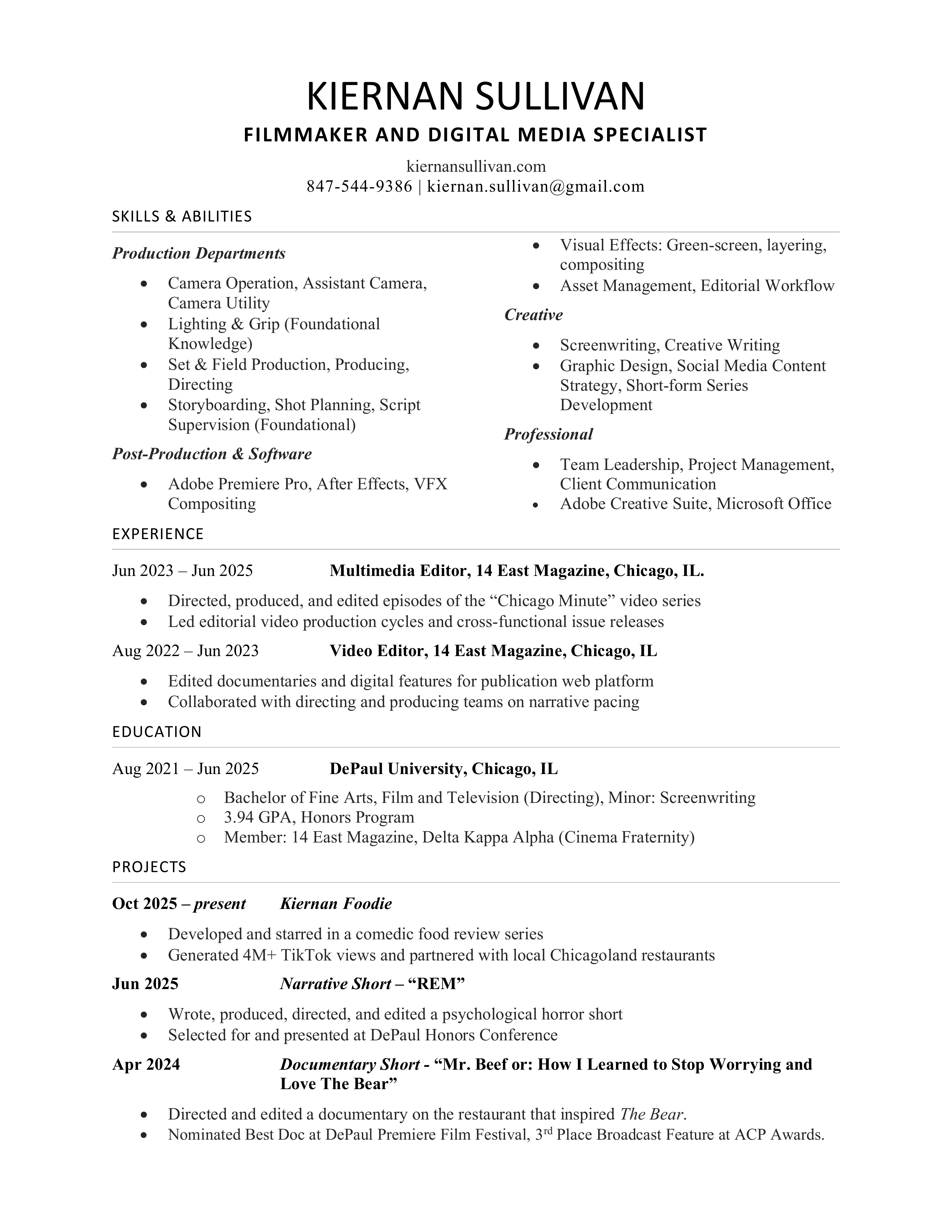 KIERNAN SULLIVAN (he/him) is a 22-year-old filmmaker from Algonquin, IL who graduated from DePaul University in Chicago in 2025. Born an identical triplet and growing up surrounded by the Internet, Kiernan has always had fascination and best express his views through the video medium. Over the past decade, Kiernan has made an impact on what it means to be a digital creator.